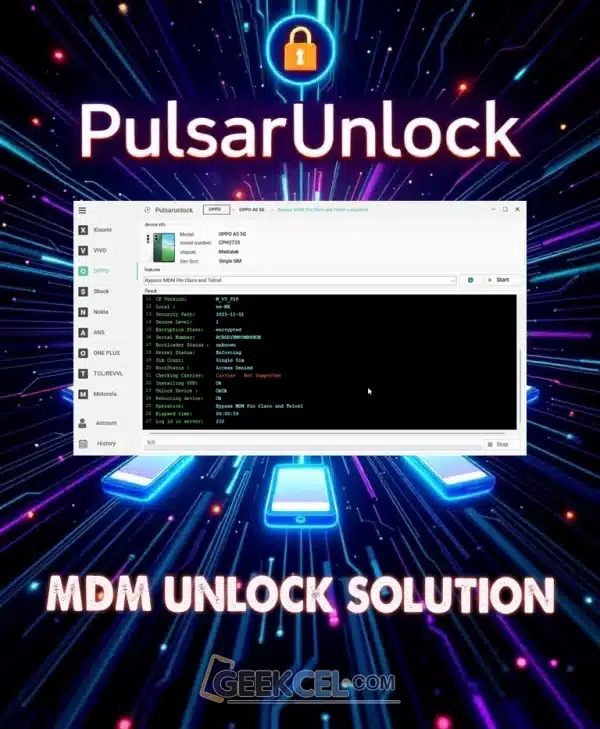 Pulsar Unlock es una herramienta de servidor especializada en el desbloqueo de celulares de última generación. Permite remover bloqueos MDM, KG y FRP de forma sencilla mediante diferentes métodos actualizados.